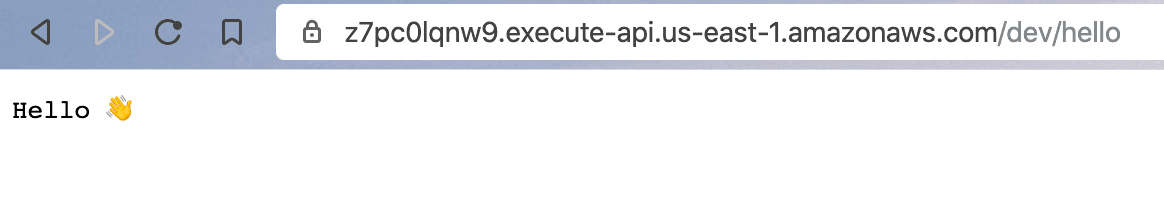 You get a URL for your lambda and some debugging output. My URL is https://z7pc0lqnw9.execute-api.us-east-1.amazonaws.com/dev/hello, if you open it in your browser, it's going to say Hello ๐